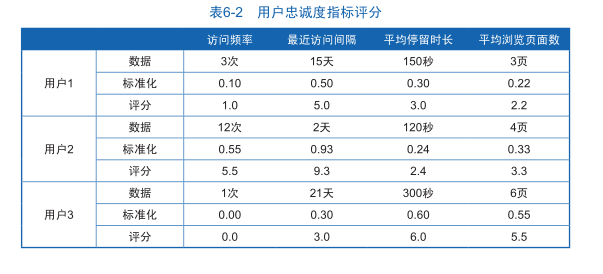 表6-2中,用戶忠誠度的4個分析指標(biāo)經(jīng)過標(biāo)準(zhǔn)化處理后統(tǒng)一以10分制的形式輸出,這樣就能直接區(qū)分每個用戶的每項指標(biāo)的表現(xiàn)好壞?;诿總€指標(biāo)的評分,可以對用戶進行篩選,比如營銷部門重點跟進經(jīng)常訪問網(wǎng)站的用戶,可以選擇訪問頻率評分大于3分的用戶,或者重點跟進用戶訪問參與度較高的用戶,可以篩選平均停留時間和平均訪問頁面數(shù)都大于3分的用戶,這樣能夠幫助營銷部門迅速定位忠誠用戶。
