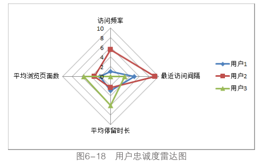 圖6-18使用了表6-2中三位用戶的評分?jǐn)?shù)據(jù)繪制而成,能夠非常形象地表現(xiàn)用戶忠誠度在各指標(biāo)上的表現(xiàn)情況,用戶1的整體忠誠度較低,用戶2在訪問頻率和訪問間隔具有較好表現(xiàn),而用戶aki訪問具有相對較高的參與度。使用雷達圖分析用戶的忠誠度主要有如下優(yōu)勢: