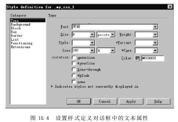 在彈出的"Style Definition(樣式定義)”對(duì)話框的"Category" 列表框中,選擇"-Type"項(xiàng),出現(xiàn)"Type"設(shè)置面板,設(shè)置my-css-1樣式的各種屬性,如圖10.4所示。