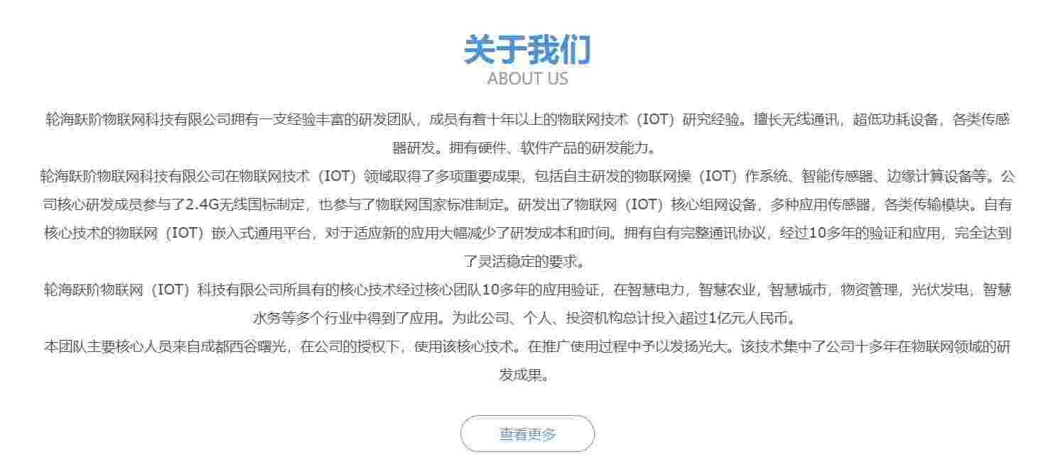 輪海躍階物聯(lián)網(wǎng)(IOT)科技有限公司所具有的核心技術(shù)經(jīng)過核心團隊10多年的應(yīng)用驗證,在智慧電力,智慧農(nóng)業(yè),智慧城市,物資管理,光伏發(fā)電,智慧水務(wù)等多個行業(yè)中得到了應(yīng)用。為此公司、個人、投資機構(gòu)總計投入超過1億元人民幣。