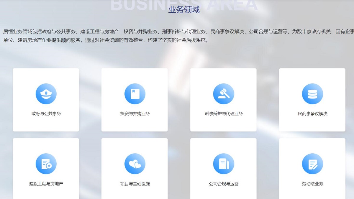 展恒業(yè)務(wù)領(lǐng)域包括政府與公共事務(wù)、建設(shè)工程與房地產(chǎn)、投資與并購(gòu)業(yè)務(wù)、刑事辯護(hù)與代理業(yè)務(wù)、民商事爭(zhēng)議解決、公司合規(guī)與運(yùn)營(yíng)等,為數(shù)十家政府機(jī)關(guān)、國(guó)有企事業(yè)單位、建筑房地產(chǎn)企業(yè)提供顧問(wèn)服務(wù),通過(guò)對(duì)社會(huì)資源的有效整合,構(gòu)建了堅(jiān)實(shí)的社會(huì)后援系統(tǒng)。