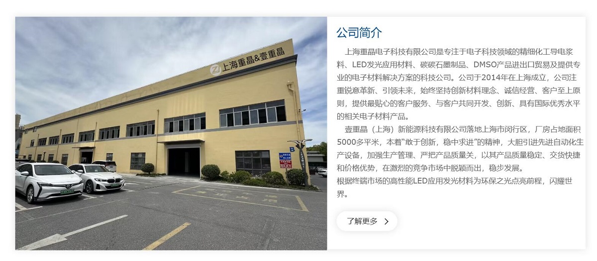 上海重晶電子科技有限公司是專注于電子科技領(lǐng)域的精細(xì)化工導(dǎo)電漿料、LED發(fā)光應(yīng)用材料、碳碳石墨制品、DMSO產(chǎn)品進(jìn)出口貿(mào)易及提供專業(yè)的電子材料解決方案的科技公司。公司于2014年在上海成立,公司注重銳意革新、引領(lǐng)未來(lái),始終堅(jiān)持創(chuàng)新材料理念、誠(chéng)信經(jīng)營(yíng)、客戶至上原則,提供最貼心的客戶服務(wù)、與客戶共同開發(fā)、創(chuàng)新、具有國(guó)際優(yōu)秀水平的相關(guān)電子材料產(chǎn)品。