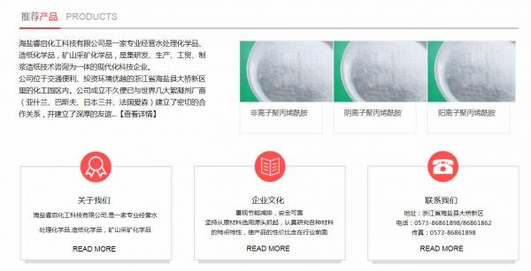 海鹽睿*化工科技有限公司選用我司企業(yè)化工原料行業(yè)的網(wǎng)站優(yōu)化產(chǎn)品,其SEO關(guān)鍵詞有 嘉興污水絮凝劑,嘉興污水處理廠,嘉興聚丙烯酰胺廠家,海鹽污水絮凝劑,海鹽污水處理廠,造紙化學(xué)品廠家,礦山凈水劑,洗沙凈水劑。其特點是用很合適的展示方式、展示效果、站點框架,把客戶及其用戶很關(guān)心的問題突出表現(xiàn);并以簡潔明朗的設(shè)計風(fēng)格,清晰展現(xiàn)公司水平實力,確保一秒抓住目標(biāo)用戶眼球,給用戶留下良好的第一印象。海鹽睿*化工科技有限公司成立于2012年,是經(jīng)海鹽市市場監(jiān)督管理局審核的有資質(zhì)的公司,其統(tǒng)一社會信用代碼:91330424**289801X8。公司地址:浙江省海鹽縣大橋新區(qū)。