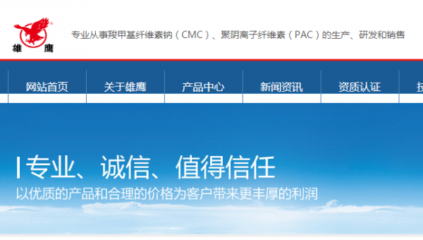 安丘市*鷹纖維素有限責任公司是由原安丘市纖維素廠組建而成,始建于一九八五年,是專業(yè)從事羧甲基纖維素鈉(CMC)、聚陰離子纖維素(PAC)的生產、研發(fā)和銷售的高新技術企業(yè);公司坐落于山東濰坊,現占地面積9萬多平方米, 年產羧甲基纖維素鈉25000噸和聚陰離子纖維素5000噸。公司主導產品“雄鷹”牌羧甲基纖維素鈉廣泛應用于食品、洗滌、石油、卷煙、造紙、陶瓷、印染、紡織、醫(yī)藥、焊接等工業(yè)。公司通過了 ISO9001質量管理體系認證、HACCP 食品安全管理體系認證,伊斯蘭HALAL 和 猶太KOSHER認證。自一九九五年以來,公司先后被安丘市委、市府評為"最佳經濟效益企業(yè)",被中國農業(yè)銀行濰坊市分行評為"AAA級信用企業(yè)",被國家農業(yè)部評為"全國質量管理達標企業(yè)"。一九九五年HPMC纖維素獲山東科技進步二等獎。二00六年十月,"雄鷹"被山東省宣傳部評為山東省民營企業(yè)知名品牌。二00七年,"雄鷹"商標,被評為山東省著名商標。公司主要市場分布于浙江、安徽、上海、四川、江蘇、山西、山東等省市,并出口東南亞,中東,非洲,歐洲,美洲,日韓等國家(地區(qū))。