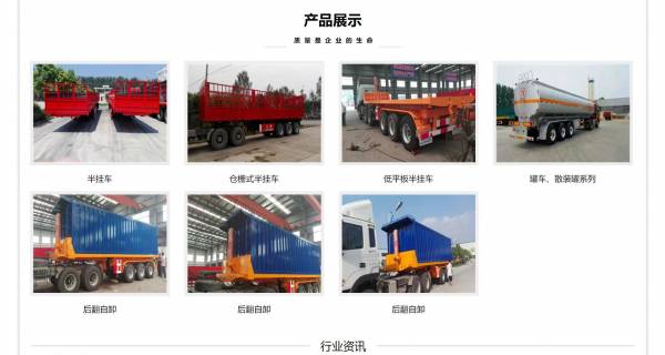 目前我公司生產(chǎn)集裝箱平板半掛車、集裝箱運(yùn)輸車、主車、半掛自卸車、各種系列半掛車、全掛車、廂式貨車、車輛運(yùn)輸車、上海50掛、天津60掛車,車輛噸位從8噸*60噸不等,產(chǎn)品種類有40多種,并承接專用車及**車輛的改裝設(shè)計(jì)業(yè)務(wù)。采用新技術(shù)、新工藝、新材料,及時聽取市場反饋,快速把握市場先機(jī),勇于創(chuàng)新,專用掛車經(jīng)過較近幾年的突破性發(fā)展,成為公司主流、主導(dǎo)產(chǎn)品,銷售量每年都以90%以上的速度遞增,在全國同行業(yè)中銷售排名前列。